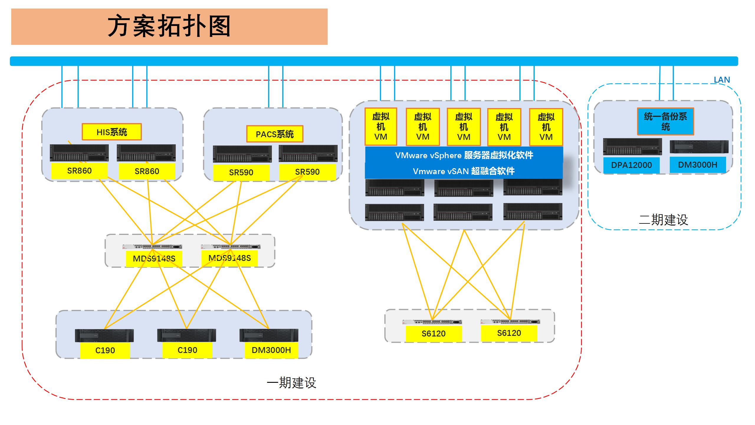 基于吳起縣人民醫(yī)院的實(shí)際需求,在預(yù)算非常有限的情況下,藍(lán)島科技攜手聯(lián)想提供了令用戶(hù)滿(mǎn)意的解決方案,方案以聯(lián)想ThinkSystem SR860作為HIS系統(tǒng)服務(wù)器,SR860采用英特爾至強(qiáng)可擴(kuò)展處理器,為HIS系統(tǒng)的運(yùn)行提供了卓越的速度和可靠性;部署2臺(tái)NetApp C190通過(guò)SnapMirror-Business Continuity方式實(shí)現(xiàn)存儲(chǔ)級(jí)雙活;部署1臺(tái)DM3000H主要運(yùn)行PACS數(shù)據(jù)庫(kù),未來(lái)通過(guò)SnapMirror,組成高可用環(huán)境;以6*VX5520構(gòu)建基于vSAN的超融合虛擬化資源池,搭載起吳起縣人民醫(yī)院的其他業(yè)務(wù)系統(tǒng),實(shí)現(xiàn)統(tǒng)一管理,彈性調(diào)度,靈活分配。