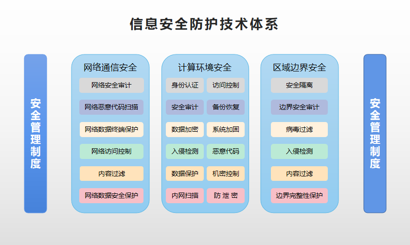 信息系統(tǒng)的安全建設包括三方面:一是技術安全體系建設;二是管理安全體系建設;三是運行保障安全體系建設。其中,技術安全體系設計和建設是關鍵和重點。 信息安全防護技術整體解決方案